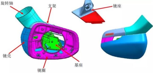 汽車后視鏡一般由鏡圈、基座、鏡殼、支架、旋轉軸、鏡座等零件組成。后視鏡產品外觀要求嚴格,高配一般表面細紋處理,低配一般噴漆處理。根據不同的車型,后視鏡有分體式與整體式之分,中高檔車采用分體式設計,低檔車采用整體式設計。