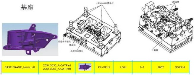 本模具由于滑塊多,且有兩個定模隧道斜滑塊,滑塊與定模鑲件也多,因此模具工藝較復雜,除了需要普通機床加工外,還需要CNC,深孔鉆,五軸CNC,火花機,線切割等高精度機床來加工。制作工藝復雜,制作難度較大。根據汽車后視鏡鏡座的結構特征,材料特征,塑件表面質量與批量要求等,設計了通過冷流道進膠方式,提高了熔融塑料在注塑