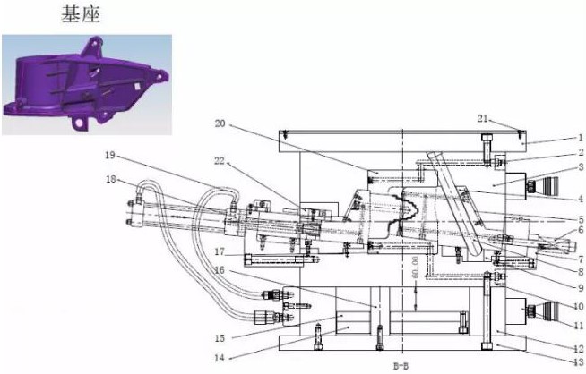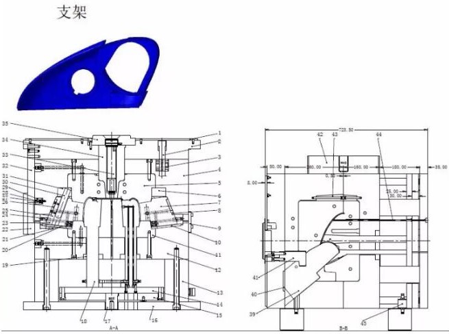 本模具采用推桿+推塊+推塊推出的脫模機構,這是汽車后視鏡支架模具的典型結構,設計本類模具要注意,這種結構必須是手工
