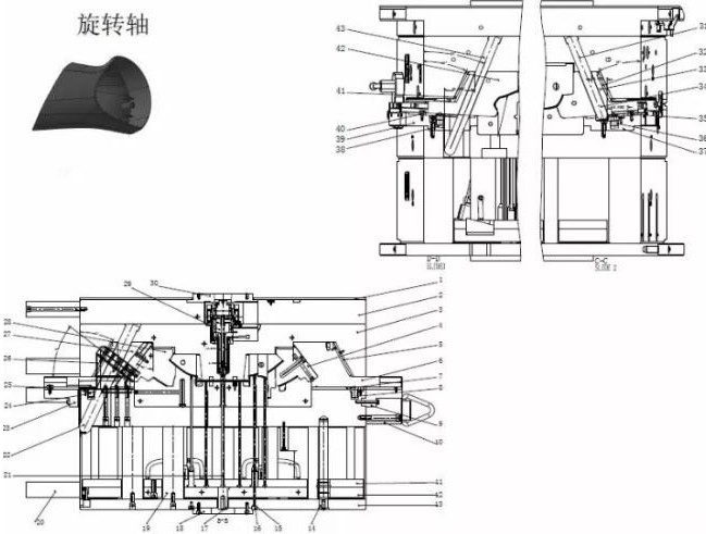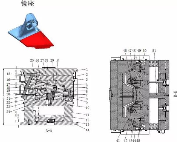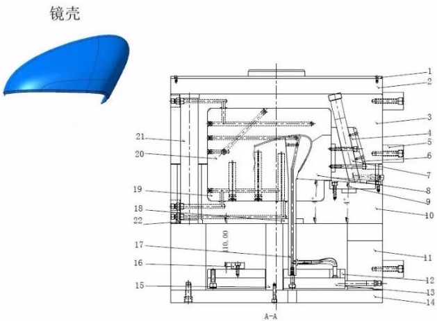 本模具采用推桿+推塊+斜推塊推出的脫模機構,這是汽車后視鏡鏡殼模具的典型結構,設計本類模具要注意,這種結構必須是手